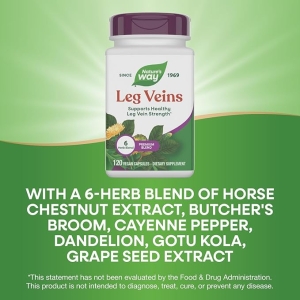 Nature s Way Leg Veins está formulado para ayudar a fortalecer las venas de las piernas. La mezcla de hierbas premium incluye extracto de semilla de castaño de Indias, escoba de carnicero, pimienta de cayena, diente de león, gotu-kola y extracto de semilla de uva, ingredientes herbales que se han utilizado durante siglos.