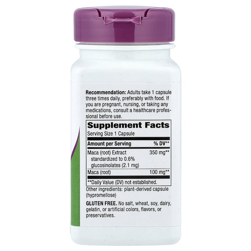 Extracto de Maca (raíz), estandarizado a glucosinolatos al 0,6% (2,1 mg); Maca (raíz); Cápsula derivada de plantas (hipromelosa).