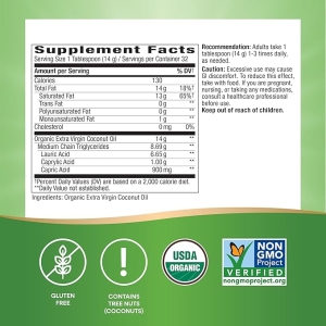 Puro, orgánico, sin refinar, sin blanquear y sin hexano. Nuestra fuente premium, los cocos sin OGM son de calidad superior. Nuestro aceite de coco le proporciona un 62 % de triglicéridos de cadena media (MCT) por porción.