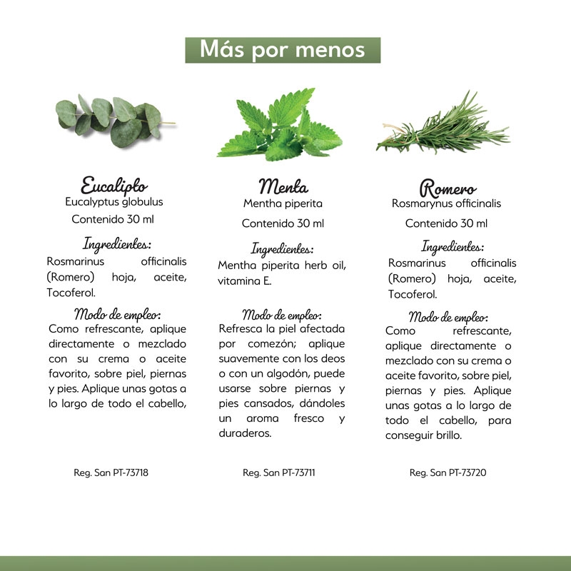 Contiene un aceite Eucalipto D natura, Menta D natura y Romero D natura.