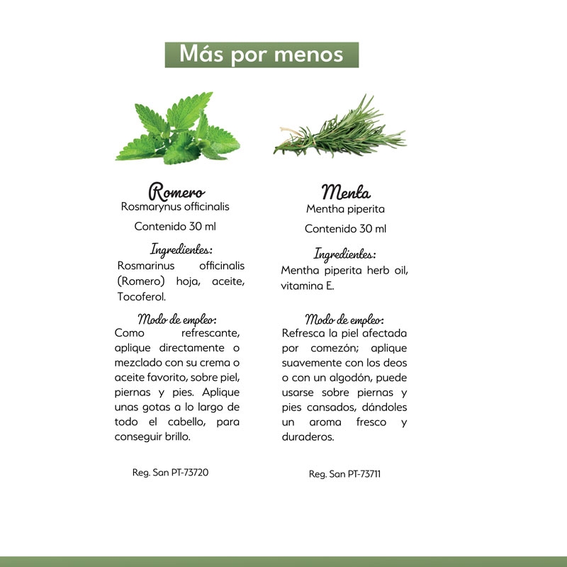 Contiene un aceite Menta D´natura: mentha piperita herb oil, vitamina E y Romero D natura: Rosmarinus Officinalis (Romero) hoja, aceite, tocoferol.