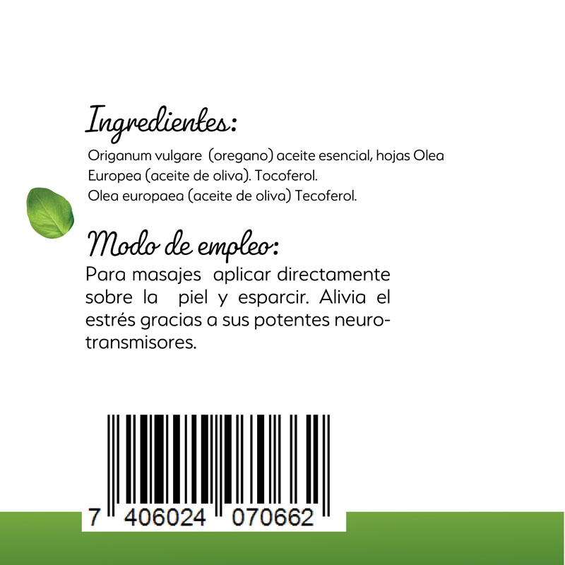 Orégano (Origanum vulgare) aceite esencial hojas, Aceite de Oliva (Olea Europea). Tocoferol.
