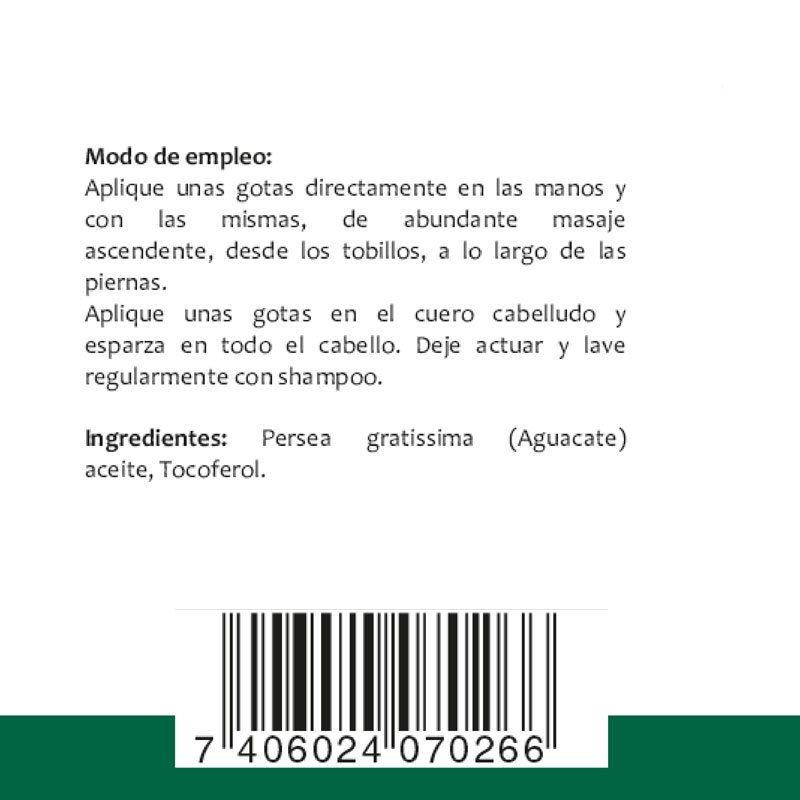 Uso tópico: Aplica el Aceite de Aguacate directamente sobre la piel y el cabello para hidratar, suavizar y fortalecer.