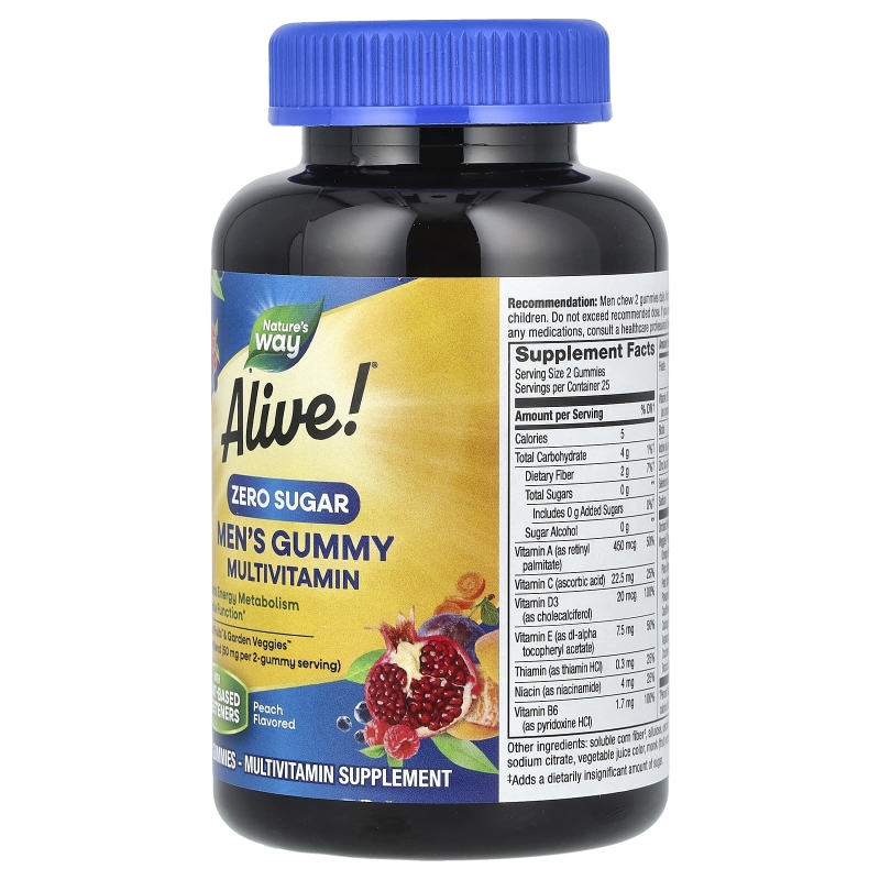El Multivitamínico para hombre sin azúcar Alive!® es una opción deliciosa y saludable diseñada para cubrir las necesidades diarias de vitaminas y minerales. Con una potente combinación de 13 nutrientes esenciales, estas gomitas incluyen vitaminas B para convertir los alimentos en energía, así como vitamina D3 y zinc para apoyar el sistema inmunológico y la función muscular. A diferencia de otros suplementos, esta fórmula es completamente libre de azúcar y no contiene alcoholes de azúcar, manteniendo su sabor con extractos naturales de stevia y fruta del monje.